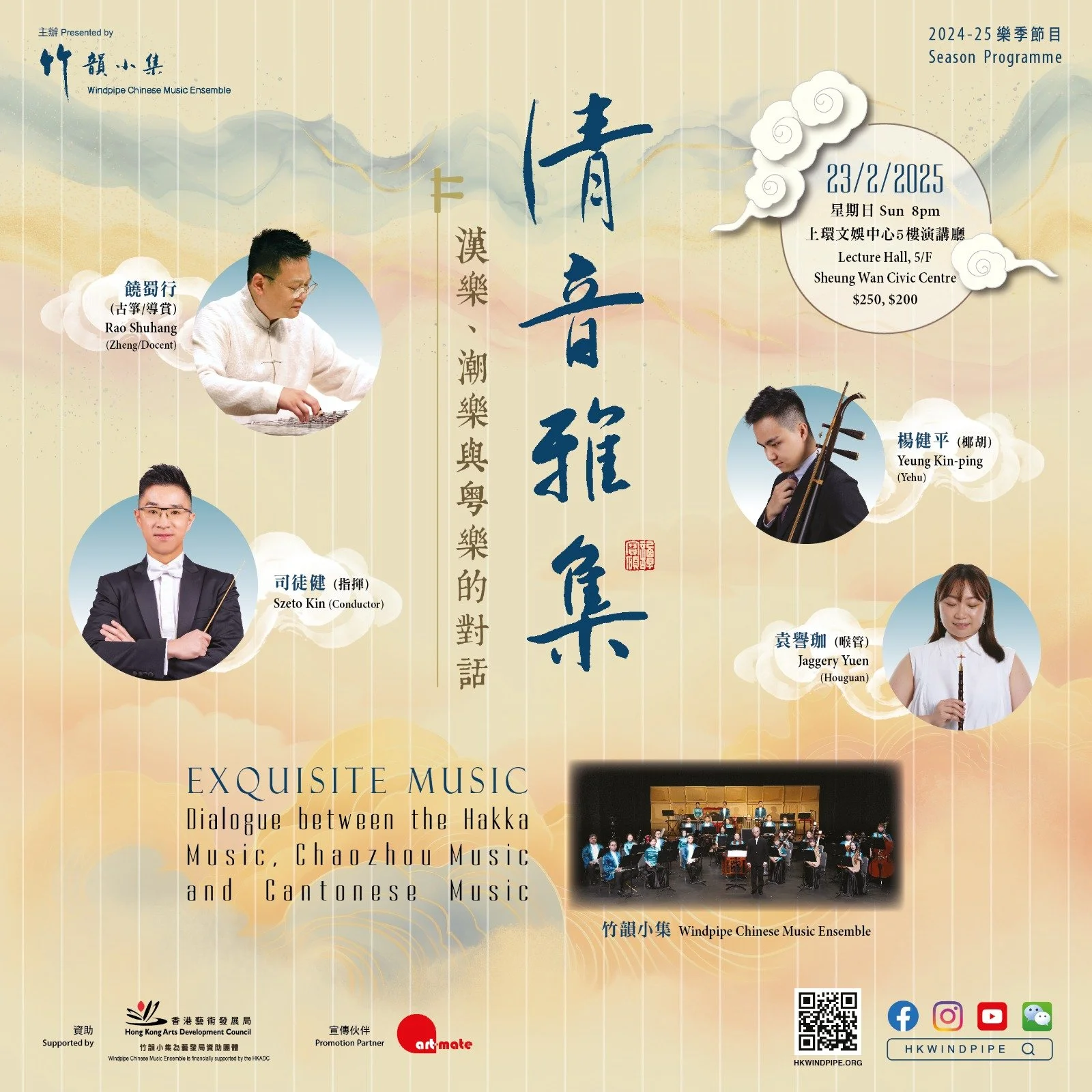 「清音雅集——漢樂、潮樂與粵樂的對話」音樂會特邀廣東客家箏派傳人、星海音樂學院國樂系客座副教授饒蜀行與竹韻小集合作,呈現嶺南箏樂及「嶺南三韻」傳統名曲,包括《禪院鐘聲》、《福德祠》、《寒鴉戲水》、《西廂詞》、《出水蓮》等,展示嶺南文化的多元面貌,貫徹竹韻小集「植根嶺南」的藝術理念。
